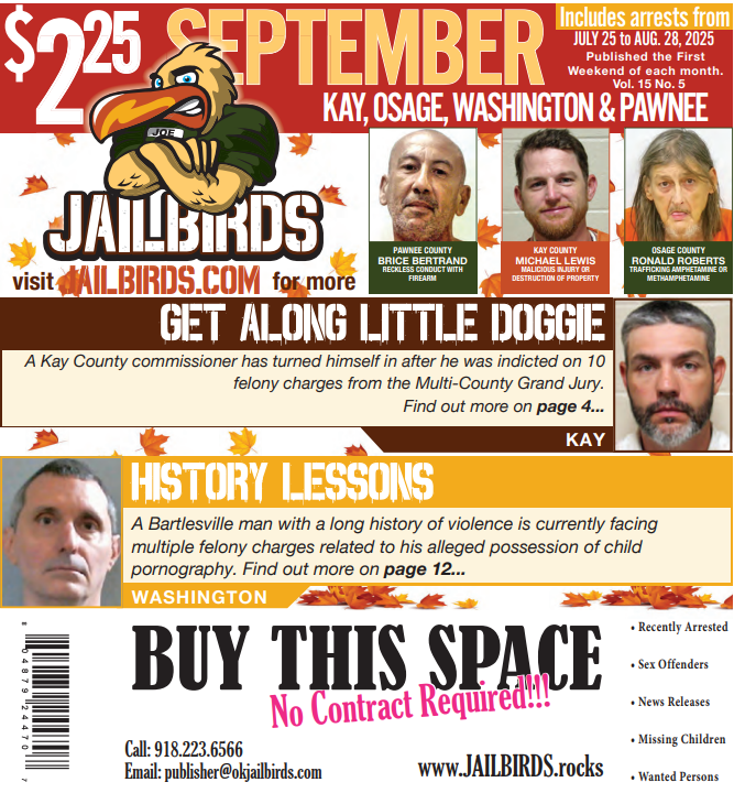 This is a downloadable, high-quality PDF version of JAILBIRDS for: KAY, WASHINGTON, OSAGE, PAWNEE - September 2025