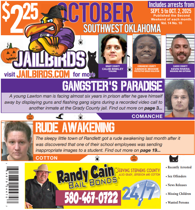 This is a downloadable, high-quality PDF version of JAILBIRDS for: COMANCHE, CADDO, COTTON, KIOWA, TILLMAN, JACKSON, STEPHENS, GRADY - October 2025