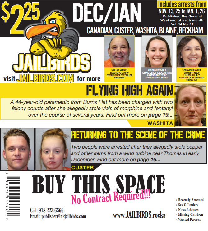 This is a downloadable, high-quality PDF version of JAILBIRDS for: CANADIAN, BLAINE, CUSTER, WASHITA, BECKHAM - December 2025 / January 2026