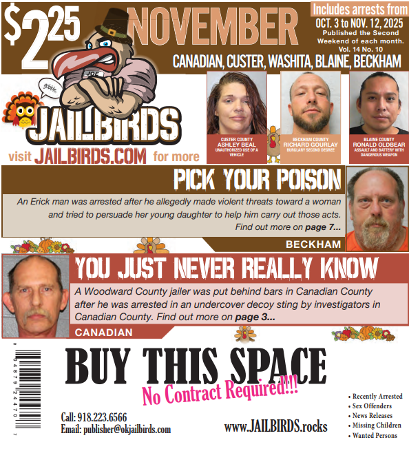 This is a downloadable, high-quality PDF version of JAILBIRDS for: CANADIAN, BLAINE, CUSTER, WASHITA, BECKHAM - November 2025