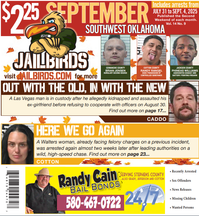 This is a downloadable, high-quality PDF version of JAILBIRDS for: COMANCHE, CADDO, COTTON, KIOWA, TILLMAN, JACKSON, STEPHENS, GRADY - September 2025