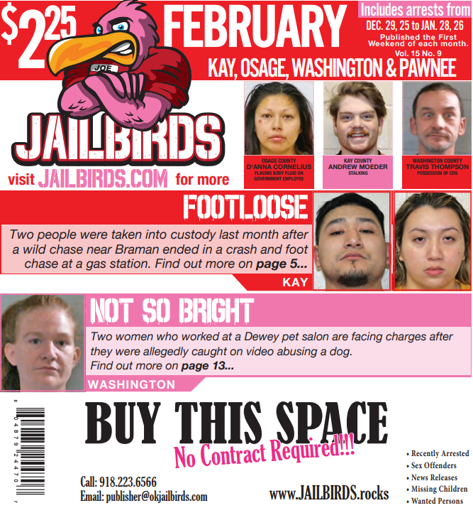 This is a downloadable, high-quality PDF version of JAILBIRDS for: KAY, WASHINGTON, OSAGE, PAWNEE - February 2026