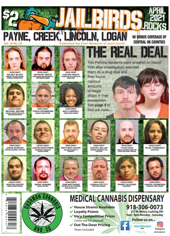 This is a downloadable, PDF version of JAILBIRDS for: PAYNE, CREEK, LINCOLN, LOGAN - April 2021