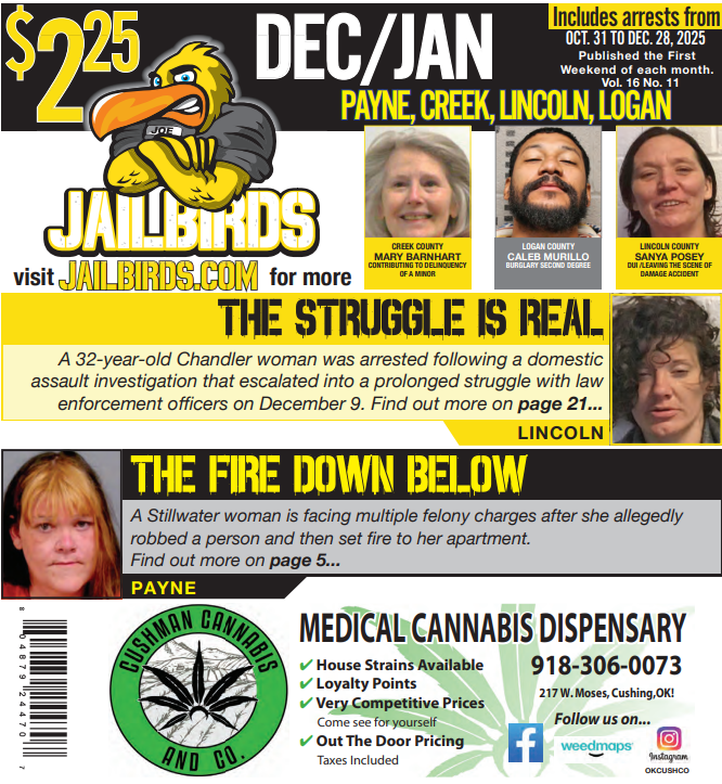 This is a downloadable, high-quality PDF version of JAILBIRDS for: PAYNE, CREEK, LINCOLN, LOGAN - December 2025 / January 2026