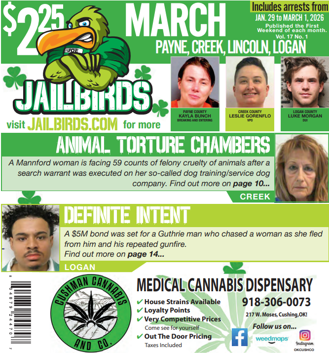 This is a downloadable, high-quality PDF version of JAILBIRDS for: PAYNE, CREEK, LINCOLN, LOGAN - March 2026