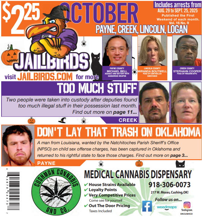 This is a downloadable, high-quality PDF version of JAILBIRDS for: PAYNE, CREEK, LINCOLN, LOGAN - October 2025