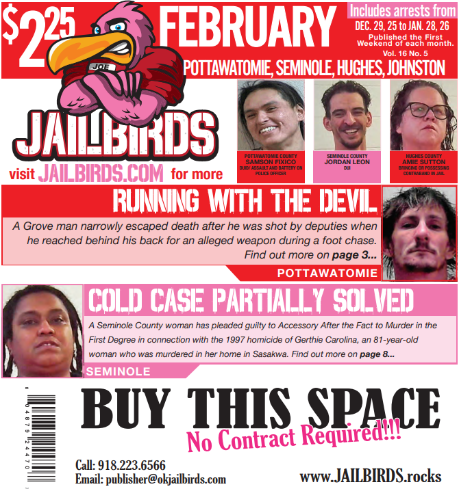 This is a downloadable, high-quality PDF version of JAILBIRDS for: POTTAWATOMIE, SEMINOLE, HUGHES, JOHNSTON - February 2026