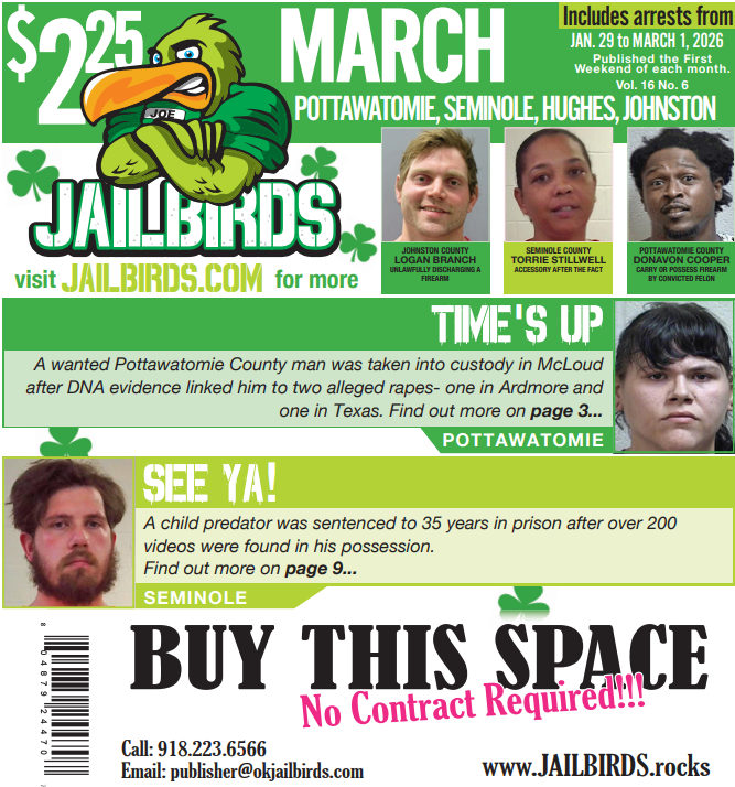 This is a downloadable, high-quality PDF version of JAILBIRDS for: POTTAWATOMIE, SEMINOLE, HUGHES, JOHNSTON - March 2026