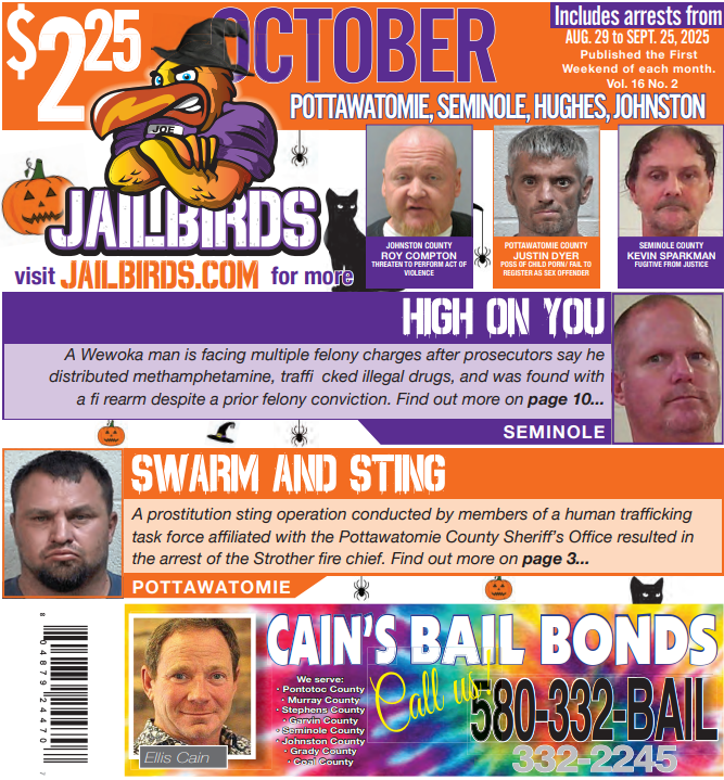 This is a downloadable, high-quality PDF version of JAILBIRDS for: POTTAWATOMIE, SEMINOLE, HUGHES, JOHNSTON - October 2025