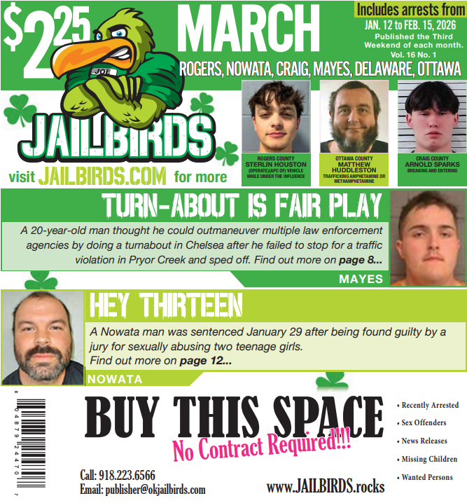 This is a downloadable, high-quality PDF version of JAILBIRDS for: ROGERS, NOWATA, CRAIG, MAYES, DELAWARE, OTTAWA - March 2026